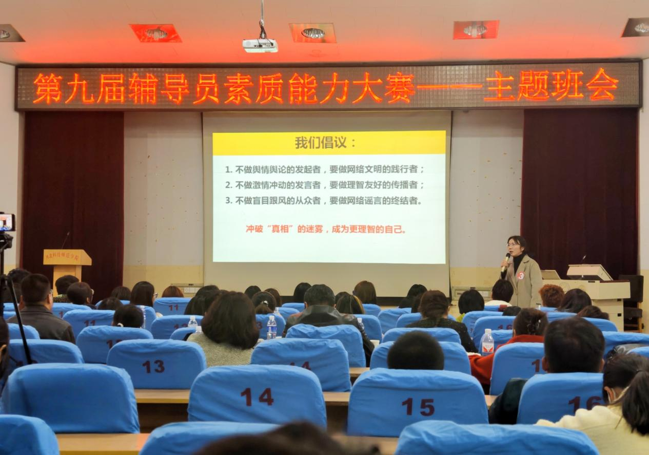 10月31日下午,公司第九届辅导员素质能力大赛主题班会项目在昌黎校区学术报告厅成功举办。公司王仕琪老师以《让子弹飞一会——冲破“真相”的迷雾,树立正确价值观》取得优异成绩。